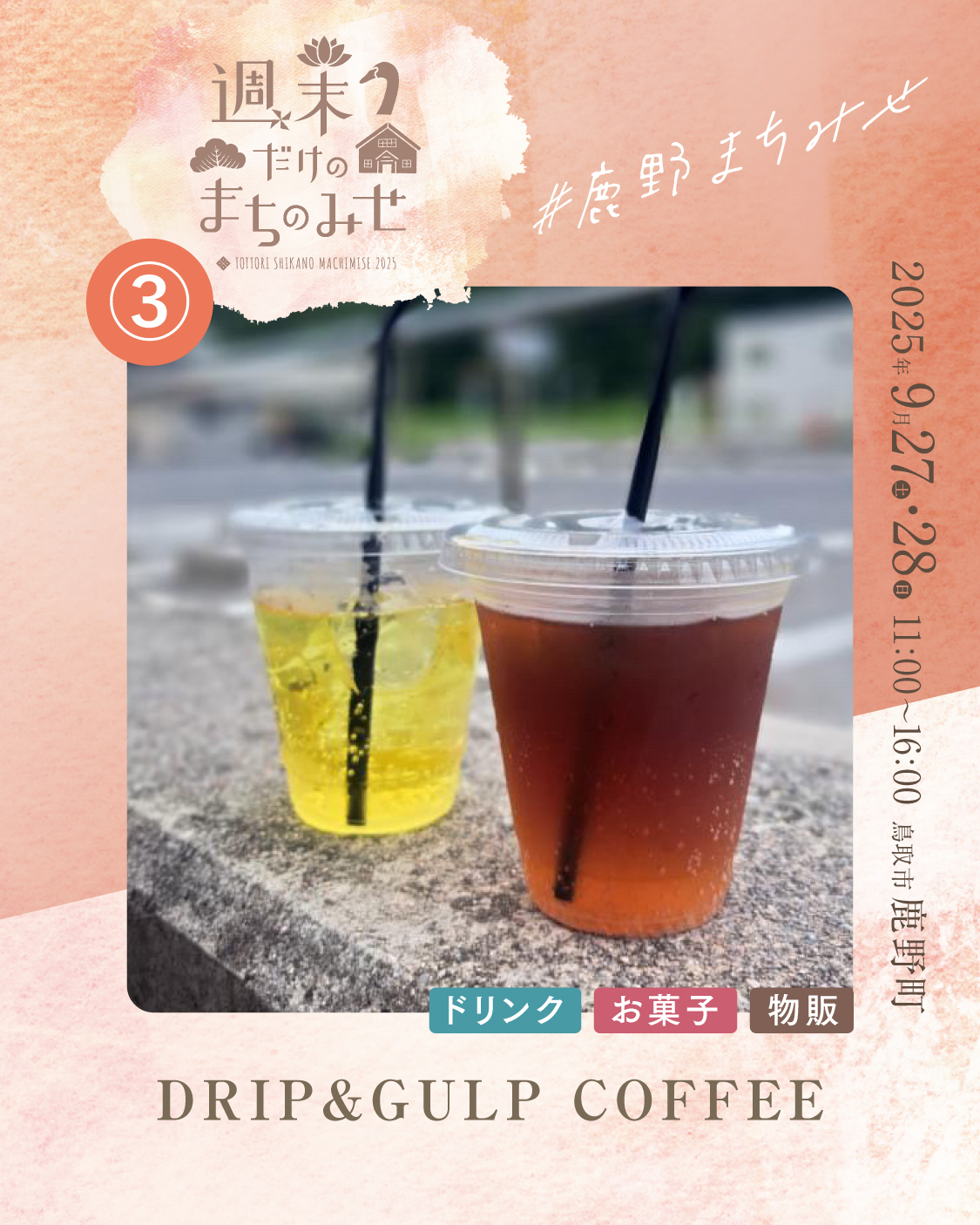 DRIP&GULP COFFEE 2025.07.252025.08.21 お気に入り登録 1 machimise2025_Instagram_3_a_1machimise2025_Instagram_3_a_2machimise2025_Instagram_3_a_3 \スペシャルティコーヒーの香りをお届けします/ スペシャルティコーヒー専門の移動販売店です。 ハンドドリップで丁寧に淹れるこだわりのコーヒーをはじめ、 まろやかなカフェオレや、カフェインを控えたデカフェもご用意。 さらに、コーヒーが苦手な方やお子さまにも楽しんでいただけるよう、 コーヒーチェリードリンクやブルーベリー、レモンソーダなど ソフトドリンクも取り揃えています。 ぜひ一杯のコーヒーから、特別なひとときをお楽しみください。 出店場所 3 お気に入り登録 1