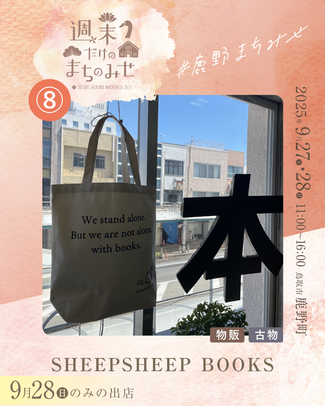 SHEEPSHEEP BOOKS 2025.07.182025.08.21 お気に入り登録 0 machimise2025_Instagram_8_c_1machimise2025_Instagram_8_c_2machimise2025_Instagram_8_c_3 鳥取市内、定有堂書店があったビルの2階で、2024年5月にオープンした本屋です。新本・古書・ZINEとオリジナルグッズを取り扱っています。主なジャンルは文芸・詩歌・歴史・社会・音楽・アート・郷土本など。 今回が初出店です!他の書店ではあまり見かけない本を色々と持っていこうと思います。たくさんの方とお会いできるのを楽しみにしています。 8 お気に入り登録 0