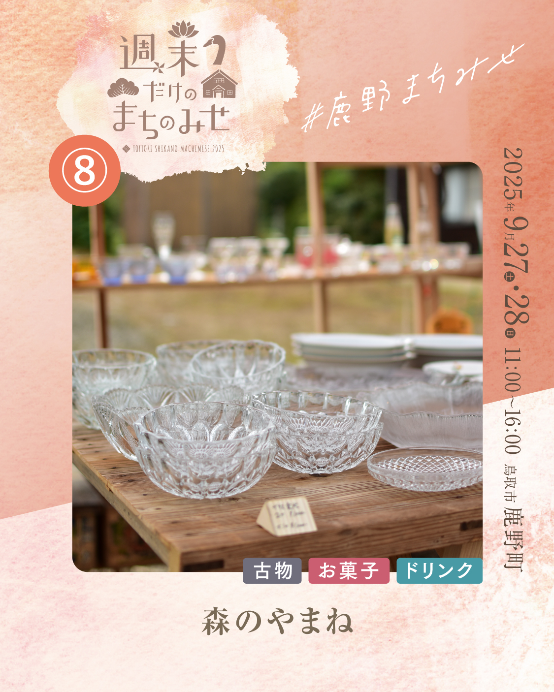 森のやまね 2025.07.172025.08.21 お気に入り登録 0 machimise2025_Instagram_8_d_1machimise2025_Instagram_8_d_2machimise2025_Instagram_8_d_3 鳥取県内の空き家からレスキューした古雑貨 と、27日は”やまねの塒”@大山町より季節のマフィンを販売します。 三朝町・大山町それぞれの地域で空き家に携 わる協力隊、森田&寺井のユニット企画で す。古道具のレスキューを通じて、お家のお 片付け・活用を促進し、暮らしてきた人の思 い出ごと未来につなぎたい。そんな想いか ら、家とモノの循環のしくみづくりを目指し て活動しています。 出店場所 8 お気に入り登録 0