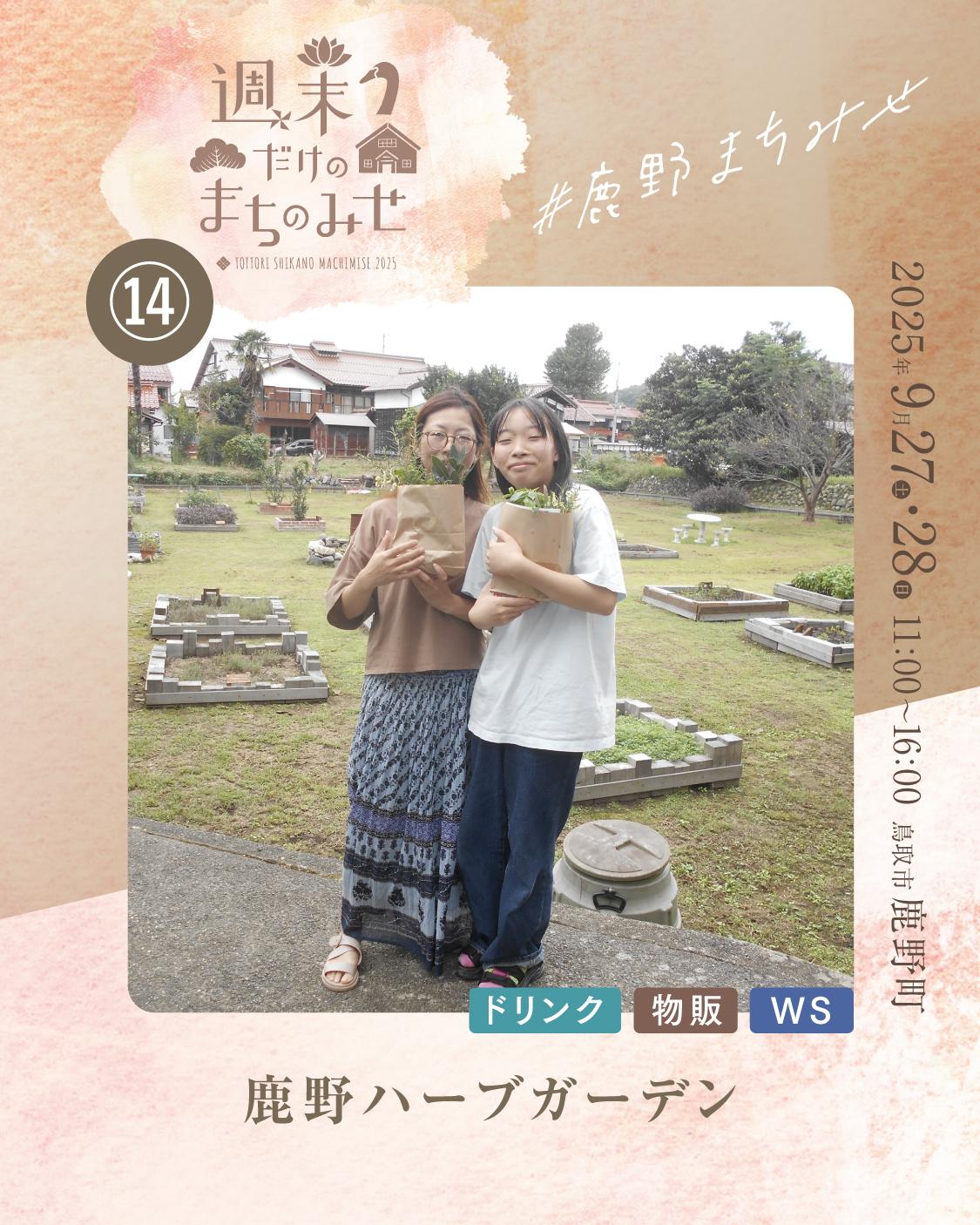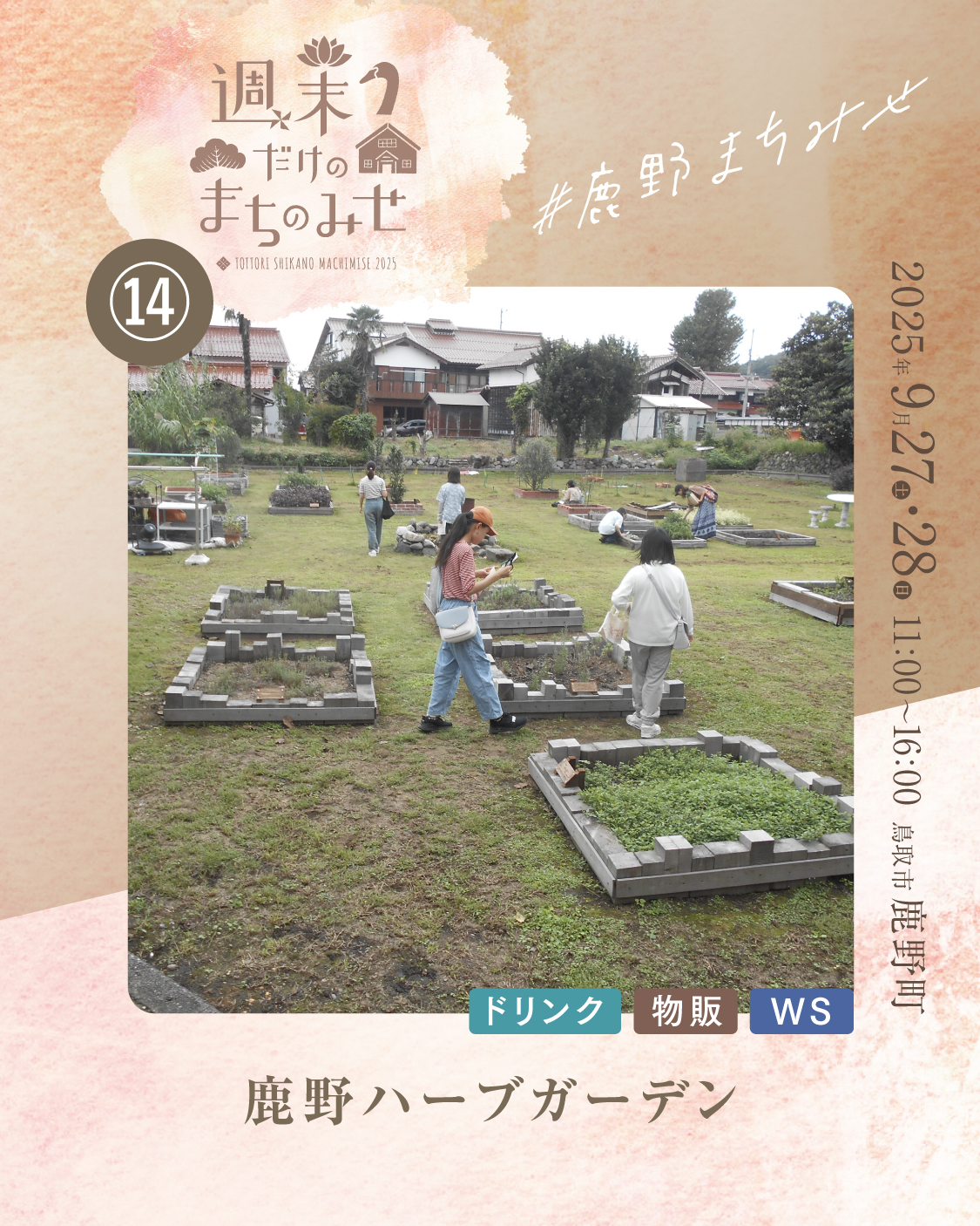 鹿野ハーブガーデン 2025.07.102025.08.21 お気に入り登録 2 machimise2025_Instagram_14_a_1machimise2025_Instagram_14_a_2machimise2025_Instagram_14_a_3 鹿野城下町の街並みの中心に農地がありました。休耕田となっていましたが「鹿野ハーブガーデン」として再生しました。現在バジルやローズマリーなど16種類のハーブを生育中です。 まちみせでは【ハーブ摘み体験】が出来ます。また【ハーブティ】や【ドライハーブ】の販売を行います。 是非鹿野の中庭的「鹿野ハーブガーデン」にお散歩気分で遊びに来てください。 出店場所 14 お気に入り登録 2
