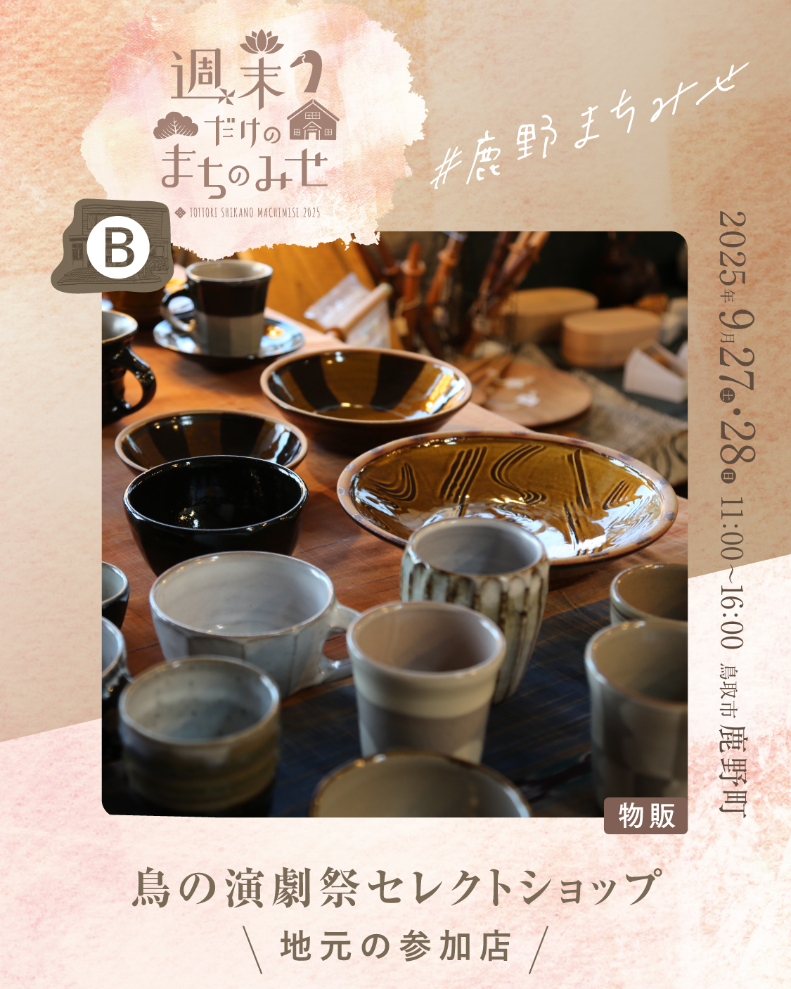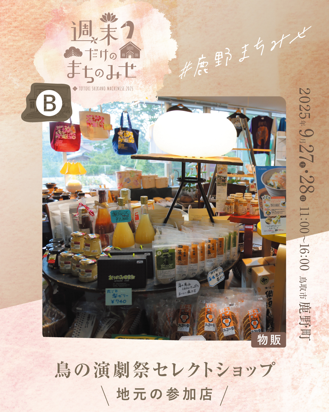 鳥の演劇祭セレクトショップ 2025.07.052025.08.21 お気に入り登録 0 machimise2025_Instagram_B_b_1machimise2025_Instagram_B_b_2 毎年大好評の演劇祭限定のスペシャルショップ、今年もオープンです!鳥の劇場の俳優・齊藤頼陽がオススメする鳥取の民芸品、工芸品や食べ物、鳥グッズを集めました。みんなが知っている銘品から、ちょっと珍しいものまで幅広く取り揃えて、皆様のお越しをお待ちいたしております。鳥の劇場内にありますが、ショップだけの利用も大歓迎です。 出店場所 B お気に入り登録 0