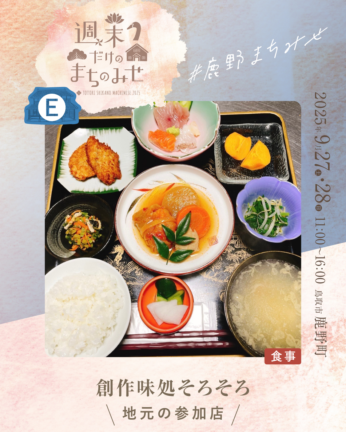 創作味処そろそろ 2025.06.092025.08.21 お気に入り登録 1 machimise2025_Instagram_E_a_1machimise2025_Instagram_E_a_2machimise2025_Instagram_E_a_3 主菜となるメイン料理とごはんにお吸い物、漬け物という基本に加えて煮物や炒め物等の小鉢料理が5品もついた満足度の高い日替わりメニューの「御城下御膳」! 「カレーうどん」や「梅うどん」の麺料理に、「卵丼」「油麩丼」などの丼料理メニューもございます! コーヒー紅茶に甘くて美味しい「ずんだ餅」、「黒ごま餅」等と一緒にいただく喫茶利用などもどうぞ! 出店場所 E お気に入り登録 1