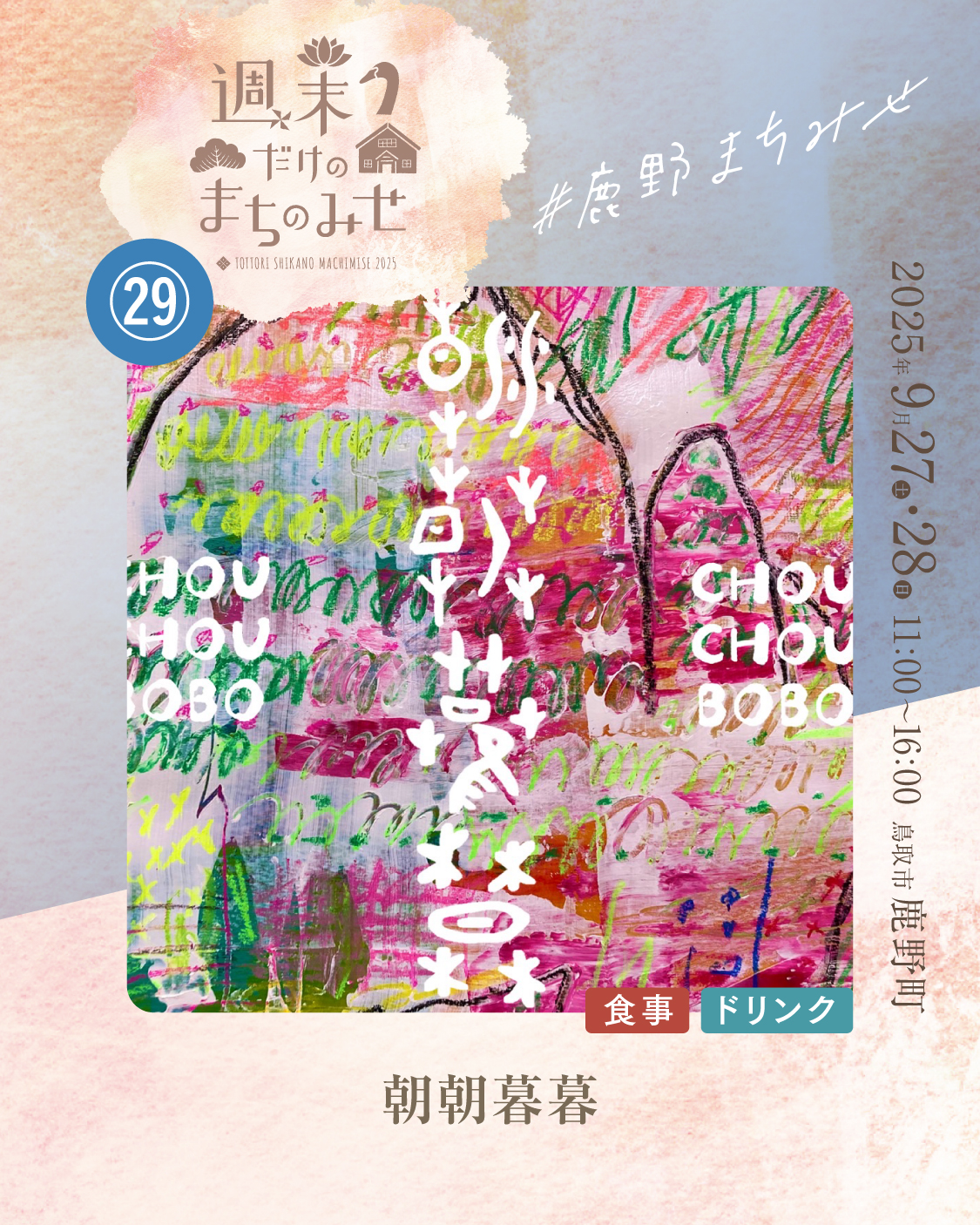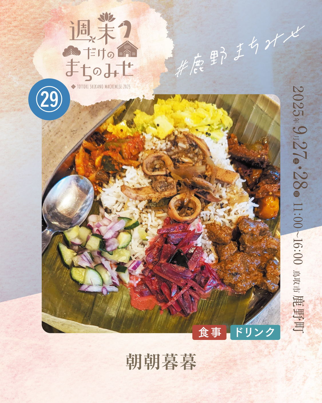 朝朝暮暮 2025.06.032025.08.21 お気に入り登録 1 machimise2025_Instagram_29_a_1machimise2025_Instagram_29_a_2machimise2025_Instagram_29_a_3 朝朝暮暮(ちょうちょうぼぼ)です 季節の野菜をたっぷり使い、見て楽しい・食べて嬉しいカレーを作っています。いろいろなおかずとルウを自由に混ぜ混ぜしながら、自分の好きな味を見つけて楽しんでもらえたら嬉しいです!!!スパイスはほどよく優しく、食べ終わったころには「なんか元気出てきた!」ってなってもらえたら幸せです。 出店場所 29 お気に入り登録 1