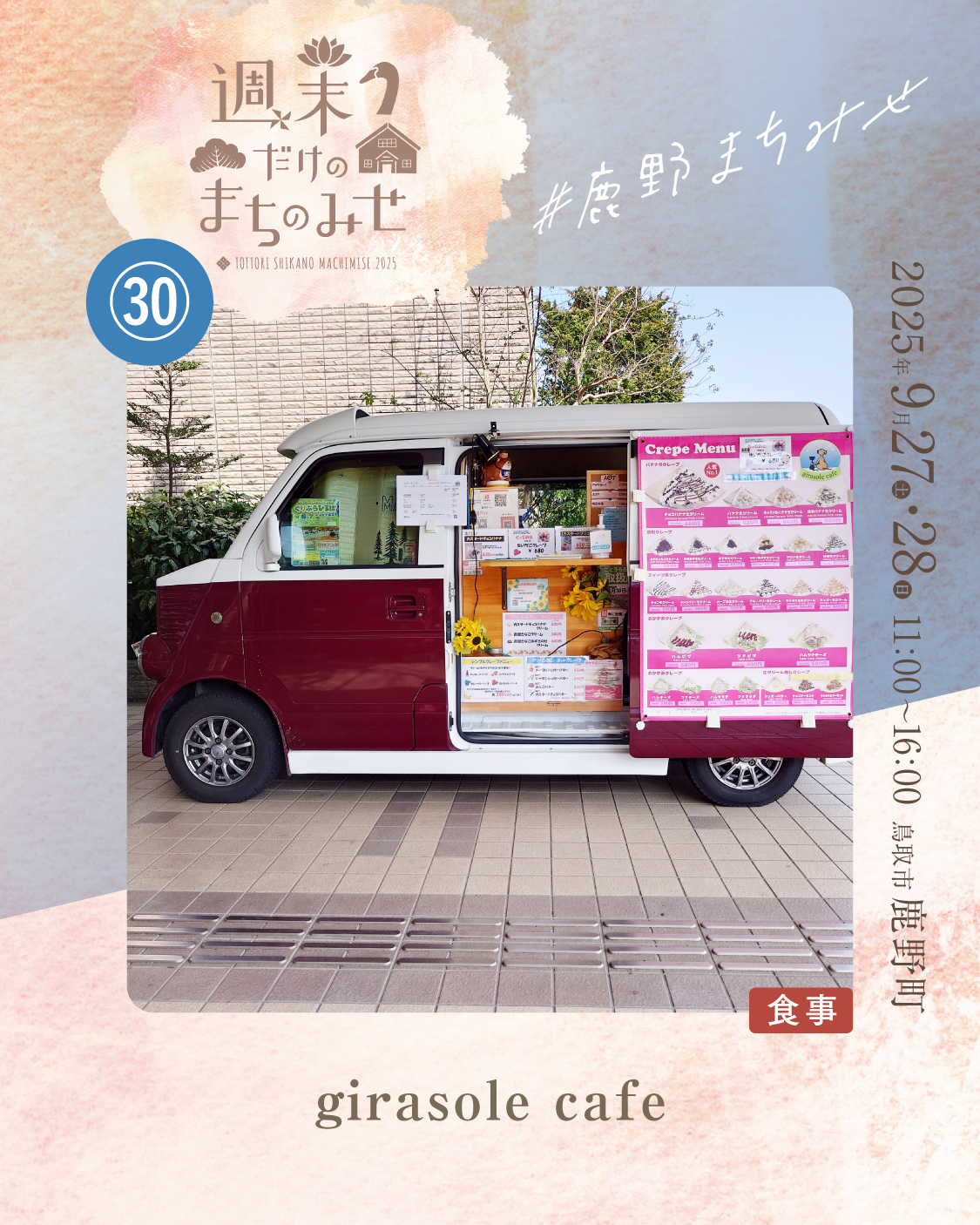 girasole cafe 2025.06.012025.08.21 お気に入り登録 1 machimise2025_Instagram_30_a_1machimise2025_Instagram_30_a_2machimise2025_Instagram_30_a_3 今年も『週末だけのまちのみせ』参加させて頂きます! 鳥取県中部地区中心にワインレッドの可愛いキッチンカーでクレープの移動販売を販売してます。 モチモチ食感の生地と甘さ控えめのクリームが特徴のクレープです。クリーム系はもちろん、おかず系やクリーム無しホットクレープなど豊富なメニューをご用意しております。 お気軽にお立ち寄り下さい! 出店場所 30 お気に入り登録 1